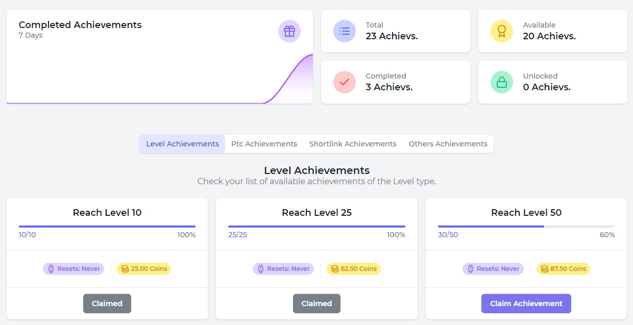 Plus, as an active user, you can unlock achievements which give coins in return. For example, watching certain amount of PTC ads or reaching a level will give you some coins.